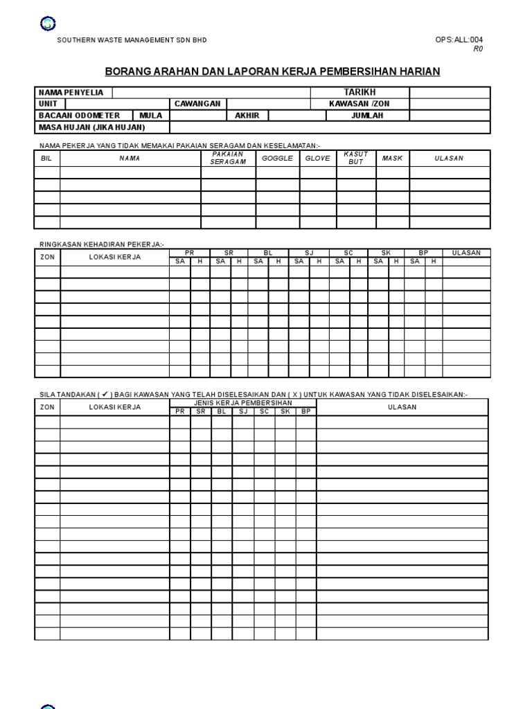 Borang Arahan Dan Laporan Kerja Pembersihan Harian Ops All 004 Pdf